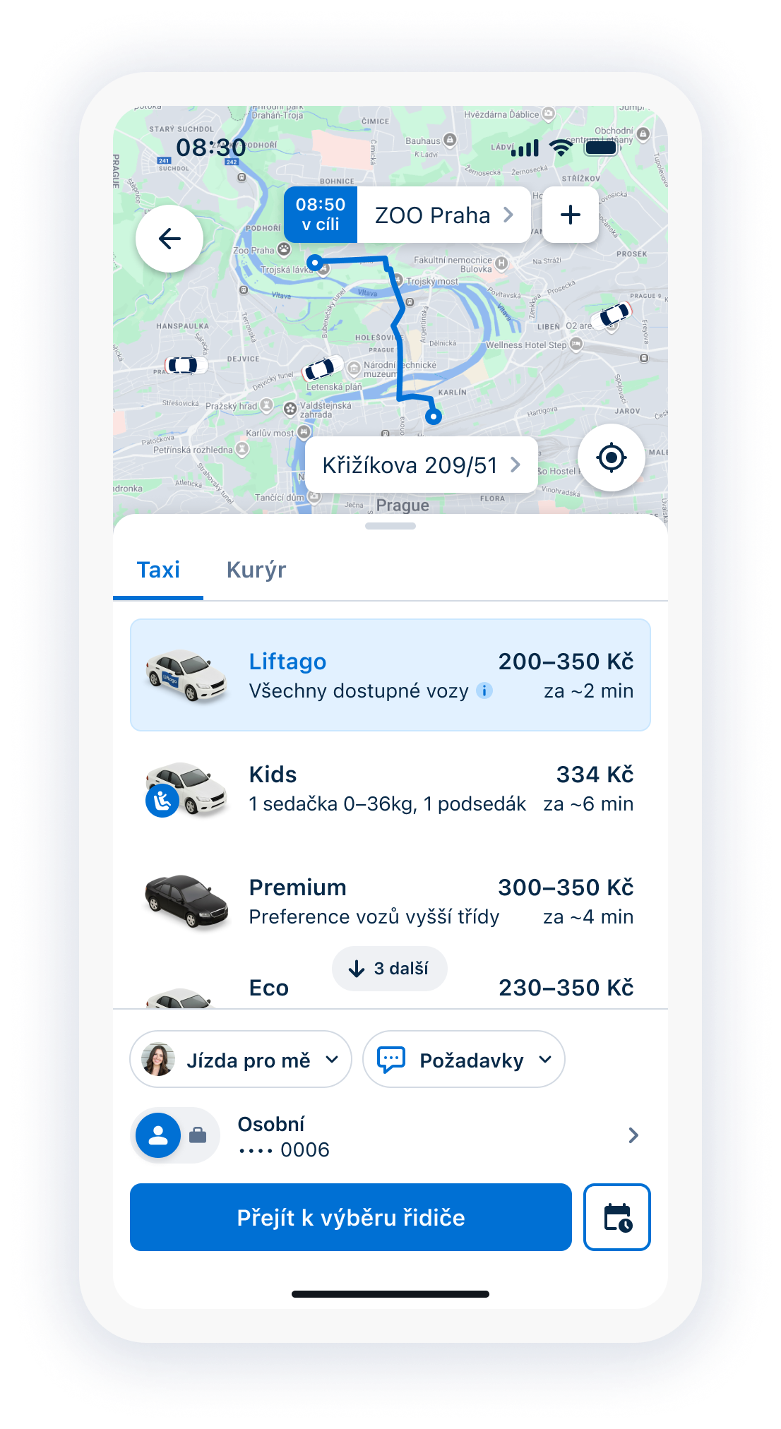 Liftago allows drivers to determine their own fares. In the app, available drivers’ offers are displayed with price, estimated arrival, rating, and vehicle type, so you can pick the one that fits you best. On the web interface, you can choose according to vehicle type.